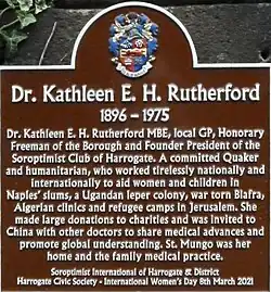 From 1933 to 1936 Rutherford was the founder president of the Soroptimist Club of Harrogate.[24][30][34] In 1937 she was elected president of the North Eastern Divisional Union of Soroptimists International, and served on its Federation Governing Board. In 1938 she was elected vice-president of Soroptimist International of Great Britain and Ireland (SIGBI).[30][45][51] On International Women's Day on 8 March 2021,[30] Harrogate Civic Society and Soroptimist International of Harrogate erected a brown plaque in honour of Rutherford, on the gatepost of her former surgery at 12 York Road, Harrogate.[34] This was done because, according to Harrogate Soroptimists, "She was an impenitent idealist, internationalist, committed Quaker striving to make a difference through raising awareness, advocacy and action". Rutherford was one of the hundred Soroptimists whose biographies were included in the #Whoisshe Campaign, a campaign designed to recognise female achievers.[24]