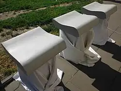 The preserved remnants of benches and plaques from the Capital Reconstruction Office, which marked buildings rebuilt with the assistance of the Capital Reconstruction Office. -