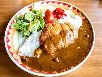 Katsu curry (Japanese: カツカレー, romanized: katsukarē) is a Japanese dish consisting of tonkatsu (pork cutlet) served with Japanese rice and curry. It is served on a large plate and is typically eaten using a spoon or fork. The cutlet is usually precut into strips, eliminating the need for a knife.