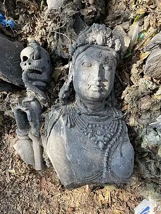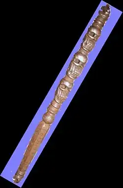 A khaṭvāṅga (Sanskrit: खट्वाङ्ग) is a long, studded staff or club with a skull at the top. The weapon is found in the iconography of Tantric Hindu as well as Tibetian Vajrayana Buddhism. It is variously described as "a skull-topped club, a skull-mounted trident, or a trident staff on which three skulls are impaled".[1]
