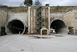 The shells of the tunnel was completed in December 2010.[12] In March 2010, the contract to equip the tunnel with slab track was awarded to Max Bögl.[38] It was installed between November 2010[38] and March 2012.[39] Installation of the slab track was largely completed in the western tunnel in October 2011 and completed in the eastern tunnel in March 2012.[40]