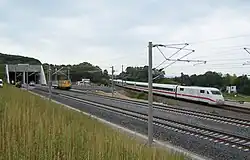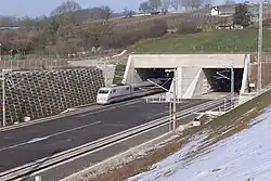 The Katzenberg Tunnel is a railway tunnel on the Karlsruhe–Basel high-speed railway that opened in December 2012. The tunnel was built to increase the capacity[1] and speed of the Mannheim–Karlsruhe–Basel railway (Rhine Valley Railway, or Rheintalbahn in German) and was built to remove the freight traffic from the towns on the old line.[2] The two parallel, single-track tunnels, which can be passed at up to 250 km/h,[3] extend from Bad Bellingen to Efringen-Kirchen[1] With a length of 9,385 m,[1] it is the third longest tunnel after the Landrücken Tunnel and the Münden Tunnel and the longest twin-bore tunnel in Germany.