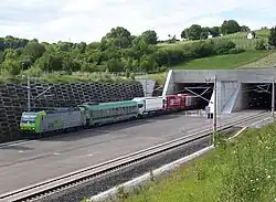 At the south portal there is an approximately four kilometre-long above-ground section, connecting with the main line of the Rhine Valley Railway at Haltingen (kilometre 264).[13] A three kilometre-long above-ground section connects the northern portal with the main line at the station of Schliengen (km 243).[13][14]