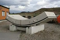 Up to 168 full rings could be prepared per week in a 24-hour operation in the segment production plant that had been erected at the south portal.[1] For each element, up to 880 kg of rebar were intertwined in about eight minutes and then filled with concrete. With the concrete setting in ten hours, the process was carried out twice a day at the height of the construction. Then the segments were taken to a checking point by cranes equipped with vacuum lifters. If they passed quality control—the proportion of the segments that failed was 0.3%—the segments were placed in a curing warehouse, where they hardened for three days and were then checked again for cracks. Finally, a neoprene seal was glued on and the segments were transported to a central warehouse. After 14 days there, they reached “B45” quality (capacity to handle 45 N per mm² or 450 kg per cm2) and after 56 days they reached “B65” quality.