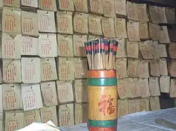 Kau chim, kau cim, chien tung,[1] "lottery poetry" and Chinese fortune sticks are names for a fortune telling practice that originated in China in which a person poses questions and interprets answers from flat sticks inscribed with text or numerals. The practice is often performed in a Taoist or Buddhist temple in front of an altar. In the US, a version has been sold since 1915 under the name chi chi sticks. It is also sometimes known as "The Oracle of Kuan Yin" in Buddhist traditions, a reference to the bodhisattva Guanyin. It is widely available in Thai temples, known using the Teochew dialect as siam si (Thai: เซียมซี). The similar practice is also found in Japan, named O-mikuji.