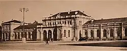After the Russian Empire lost the Crimean War, the importance of tactical modern inventions, such as railways, became evident. In February 1851 the Government of Russia made a decision to build the Saint Petersburg–Warsaw Railway line. Starting from 1858 the line connecting Saint Petersburg and Warsaw was being built. In the territory of Lithuania, the construction of the railway section Daugavpils–Vilnius–Grodno including the branch Lentvaris–Kaunas–Kybartai (Virbalis) was started in spring 1859. The first railway stations in Lithuania were constructed on this line (21 stations): the super class stations in Lentvaris and Virbalis, as well as the first class stations in Kaunas and Vilnius. Due to the hilly and unfavorable for the direct rail passage terrain around Kaunas' centre, the Kaunas Railway Tunnel and largest in Lithuania railway bridge over the Nemunas river were constructed. On the 15 August 1861 the first train left Kaunas and reached Lentvaris.[3] Kaunas railway station was officially opened on 21 February 1862. In 1944, the station was bombed by the withdrawing German army.[4] The present-day Kaunas railway station was built in 1948 on the foundation of the old station and designed by architect Petr Ashastin. Its architecture was based on the principles of classicism: strict symmetry, separate and large-scale inner spaces, horizontally continued shape, massive walls and centrally oriented stairs.[5] The station was reconstructed between 2005 and 9 April 2008.[4]