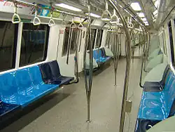 A mock-up was manufactured in Japan after Kawasaki won the contract.[27] It was shipped to Singapore and put on public display during the 1984 National Exhibition held in November at the World Trade Centre.[27] The mock-up featured three choices of seating arrangements and colour schemes; members of the public were invited to give feedback on these options.[27] The finalised interior design of the C151 trains consisted of a fully longitudinal seating arrangement.[28] The bucket seats were made of plastic; glass partitions separated the seating areas from the passenger doors.[28] Strap lines for standing passengers were installed in the middle of every car.[28] The colour scheme of each adjacent car's interior was distinct to make car identification in cases of fault reporting easier for passengers.[28] Originally the colour scheme of the driving trailer cars was orange, that of the second and fifth motor cars was blue, and that of the two centre motor cars was green.[2] There were also nine seats between two doors; this was reduced to seven after the first round of refurbishment.[28]