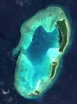 Ngaruangel (Ngaruangl) Reef, located at 08°10′N 134°38′E / 8.167°N 134.633°E, is an incipient atoll, 8.7 km (5.4 mi) northwest of Kayangel atoll, and separated from it by Ngaruangl Passage, a very deep (629 to 786 metres (2,064 to 2,579 ft) at 2 km (1.2 mi) from each atoll) and 8 km (5.0 mi) wide passage. The atoll is 5.4 km (3.4 mi) long north–south, and from 1.8 km (1.1 mi) wide in the north to 3.7 km (2.3 mi) in the south, and about 3 km (1.9 mi) on the average. The total area including the lagoon is 15 km2 (5.8 sq mi). The lagoon is shallow, with an average depth of 6 m (20 ft), has about 115 pinnacle and patch reefs, and a boat passage through the northeastern part of the barrier reef. The lagoon floor is covered with thick sand deposits and thickets of staghorn Acropora. The reef is protected by Ngaruangel Reserve.