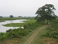 Flooded grasslands in Kaziranga with elephant and jeep trails nearby