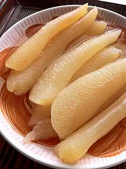 Kazunoko (数の子), in Japanese cuisine,[2] are the eggs or the ovaries (egg skeins) of the Pacific herring (Japanese: kazunoko nishin) that have been salted or dried.