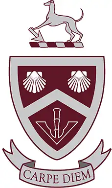 Kearsney's badge was designed by the then-headmaster, Mr RH Matterson, and the chaplain, the Rev. WH Irving, in about 1923.[3] The greyhound is taken from the arms of the founder, Sir James Liege Hulett[3] The scallop shells and the dividing chevron are from the arms of the founder of Methodism, John Wesley. The pheon, or arrowhead, is taken from the badge of Sidney Sussex College, Cambridge, where Matterson studied.[3] The motto Carpe Diem, traditionally at Kearsney translated "Seize the Day," comes from the Roman poet Horace.[4]