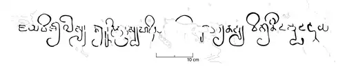 This inscription is written with Pallawa script in Sanskrit which are arranged into the form of the Anustubh metrum Shloka, which is flanked by a pair of carved images of the elephant's foot.