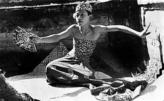 Generally, the kebyar duduk dance is performed by a single male dancer, though his make-up makes him appear almost androgynous.[8] He wears a 5-metre (16 ft) long piece of fabric (kamben), which is decorated with a gold-painted pattern known as a prada.[8][9] His accessories and headgear (the latter known as an udeng) are golden and shimmering; because of this, and the traditional designs in these accessories, the writer Kartika Suardana characterizes them as giving an "extra exotic traditional effect". In his right hand, the dancer holds a fan.[8]