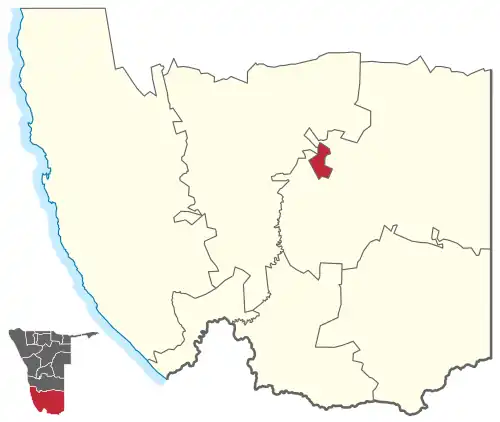 Keetmanshoop Urban is a constituency in the ǁKaras Region of Namibia. It comprises the city of Keetmanshoop, except the Krönlein suburb, covering an area of 524 km2 (202 sq mi). It had a population of 19,447 in 2011, up from 15,777 in 2001.[1][2] As of 2020 the constituency had 12,569 registered voters,[3] up from 11,534 in 2019.[4]