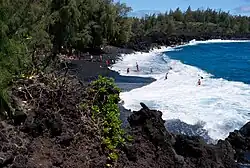 Kehena Beach is a narrow black sand beach located on the east shore of the island of Hawaii, in the Puna district. Spinner dolphins frequent the water; as a result, the beach has also been known as Dolphin Beach.[1]