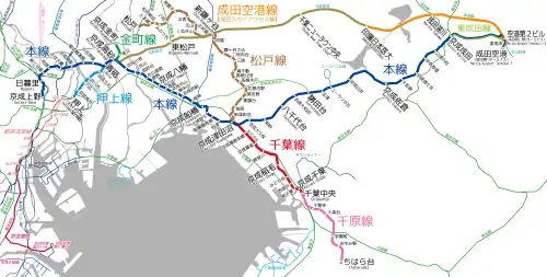 The Keisei Electric Railway Company, Ltd.[2] (stylized as K'SEI since 2001) is a major private railway in Chiba Prefecture and Tokyo, Japan. The name Keisei is the combination of the kanji 京 from Tokyo (東京) and 成 from Narita (成田), which the railway's main line connects; the combination uses different readings than the ones used in the city names. The railway's main line runs from Tokyo to Narita and the eastern suburb cities of Funabashi, Narashino, Yachiyo, and Sakura. Keisei runs an airport limited express train called the Skyliner from Ueno and Nippori to Narita International Airport.