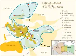 Kel Ajjer (also Kel Azjar, Kel Azjer) is a Tuareg confederation inhabiting in southwestern Libya and southeastern Algeria. Their main stronghold was Ghat,[1] followed by Ubari, both in the Fezzan region of southwestern Libya and Djanet south of the Tassili n'Ajjer in Algeria.[2] The Kel Ajjer speak Tamahaq, or Northern Tuareg.