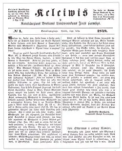 The first issue was published on 4 July 1849. The newspaper was published on Wednesdays and used Fraktur typeface. The newspaper was edited and mainly written by Kurschat. It published many religious texts and sermons, political and other news. From around 1851, its content became a little more varied. It started publishing more foreign news and occasional articles on agriculture, science, or technology.[3] These were one of the first popular science texts in Lithuanian and required the creation of various neologisms for new technical terms.[4] Some of these terms were adopted by Prussian Lithuanians and used until the early 20th century.[5] Politically, the newspaper remained loyal to the German Empire and its emperors. It did not advocate against the Germanization of Prussian Lithuanians, did not support the Lithuanian National Revival, and instead attacked liberal and democratic ideas.[3] Nevertheless, the newspaper is valued for its correct and fluent language and grammar.[3][5]