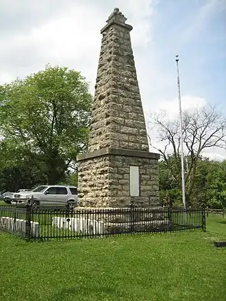 The monument was erected in 1887 and is constructed from native limestone, on its sides are three marble plaques. The apex of the monument is topped with a pyramid of cannonballs. It is 8 feet (2.4 m) square at its base and 3 feet (0.91 m) square at its top and stands 34 feet (10 m) tall.[3] At the foot of the monument is a small cemetery which contains the graves of militia men killed in four separate engagements during the Black Hawk War. The monument and cemetery are enclosed by a 15-by-25-foot (4.6 by 7.6 m) wrought iron fence.