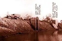 Within the dam embankment were two masonry structures. One helped support a pipe that was used as a low-level spillway. The other contained a penstock (pipe) for the hydroelectricity power plant. Neither was being used at the time of the flood.[6]