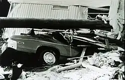 The flood killed 39 people[6] and destroyed nine houses, 18 house trailers, two college buildings and many motor vehicles. Five houses and five college buildings were also damaged. Two bridges on Toccoa Falls Drive and a culvert at County Farm Road were completely destroyed. The embankments at Georgia State Route 17 were destroyed on either side of the bridge, and one of the bridge abutments at Highview Road was destroyed. The water-supply pipe for the city of Toccoa was damaged and the city's water supply was contaminated for several days.[10] The cost of the damage was $2.8 million.[11]