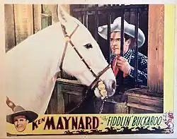 Maynard's first talkies were made for Universal Pictures. His reckless screen personality spilled over into his private life, with alcoholism and high living resulting in production delays and temper tantrums on the set. This made Maynard a problem employee, and he was released from Universal after one year. Other independent producers took a chance on the hotheaded star—among them Tiffany Productions and Sono Art-World Wide Pictures—before he returned to Universal in 1933. Maynard played several musical instruments, and was featured that year on the violin in The Fiddlin' Buckaroo, and on the banjo in The Trail Drive. Author James Horwitz has recounted the end of Maynard's tenure at Universal: when studio head Carl Laemmle asked Maynard why his latest production was such a very bad picture, the frustrated Maynard retorted, "Mr. Laemmle, I have made you eight very bad pictures," and walked out on Laemmle and Universal.[5]