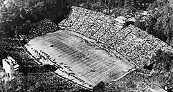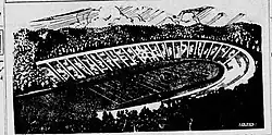 Prior to receiving the final layer of top soil, the field received an underground wiring system that will allow for flood lighting to be used in the stadium for "night spectacles" and also included telephone and telegraph wires.[27][31] Architects Atwood-Nash and Woollen made plans for a covered area for press members to write up reports, use the typewriter and transmit reports by radio.[27] By the end of February, the field was almost completely leveled.[32] T. C. Thompson and Bros. started construction once the excavation was finished.[32] In total about 55,000 cubic yards of dirt was relocated and the stadium was projected to have around 4,000 cubic yards of concrete.[32][26] All of the concrete provided for the project came from the Atlas Portland Cement company.[33] Final gift total $300,000.[34] Prior to the concrete being poured on the dirt, it was steamrolled.[32][31] The stands were planned to have 41 rows of seats.[31][26]