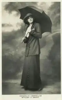 The main emphasis of the Kendall's sales and marketing throughout its history was quality and high standards, and as such advertised in quality publications like Vogue, and it used the model Twiggy for photo shoots of its clothing ranges in the 1960s.[4] It also regularly bought the entire front page of The Daily Mail. This was usually around St Swithin's day when it was said that if it rained then it would rain for the next 40 days. One such page was on 14 July 1927 where readers were urged to buy a Kendall's umbrella in exchange for a 'free' Kendella Weather House.[5]