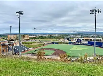 Plans were announced to build a new stadium for the West Virginia Mountaineers baseball team in 2013.[4] Ground was broken for the new ballpark at University Town Centre, an off-campus shopping and entertainment complex in Granville, adjacent to WVU's home city of Morgantown, on October 17, 2013. The ballpark has 2,500 fixed seats with additional hillside and club seating, a fan amenity deck, and a park that is open year-round.[5] The field has a synthetic surface, other than the clay pitcher's mound.[6]