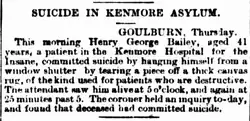 - ^ "Suicide in Kenmore Asylum". The Sydney Morning Herald. Sydney, NSW: National Library of Australia. 17 January 1902. p. 5. Archived from the original on 2 February 2017. Retrieved 27 January 2017.