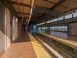Although Line 3 trains had bidirectionally operated metro trains, the tracks for Line 3 extended beyond the top-floor platform into an above-ground turning loop, similar to those found on the Toronto streetcar system. This was because Line 3 had been planned as a dedicated right-of-way streetcar line rather than a metro line. As such, the top-floor platform was designed to operate streetcars. Line 3 was later built as a medium-capacity rail transport line to use the Intermediate Capacity Transit System train models built by Bombardier Transportation. The line began using two-car trains, which were able to travel along the turning loop, but was later converted to use four-car trains, which could not be operated along the tight loop. Thus, the use of the loop for reversals was discontinued after 1988, although the loop's elevated structure remains over the passenger pick-up and drop-off building and was occasionally used as a tail track to store trains. The station platform was reduced to a single track and began using the Spanish solution of unloading and boarding passengers at Kennedy. Original floor finishing and platform edge markings for the planned light rail can also be seen along the current tracks.
