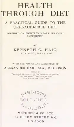 Similar to his father, Haig was a proponent of the uric-acid free diet.[2] He wrote about the subject in his book Health Through Diet, which received advice and assistance from his father. Haig argued that excess uric acid was a major cause of disease. For example, he attributed anemia, Bright's disease, cancer, diabetes, heart disease, pneumonia and rheumatism to excess uric acid.[3] Haig stated that the uric-acid free diet greatly improved his health and he had eighteen years of experience on the diet.[3]