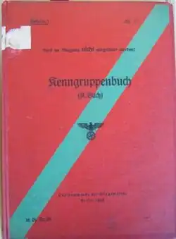 The Kenngruppenbuch was a large document with the first edition coming into force in 1938, that mostly remained unchanged when a second edition was released in 1941. The Zuteilungsliste, however, was continually updated.[2] After 1 May 1937, the Kriegsmarine had stopped using an Indicating system with a repetition of message key within the indicator, a serious security flaw, which was still being used by the Luftwaffe (German Airforce) and Heer (German Army) at the beginning of 1940, making the Naval Enigma more secure.[3] The introduction of the K Book was designed to avert this serious security flaw.