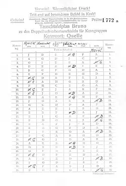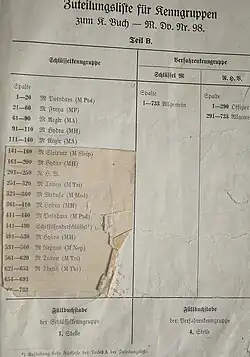 The Kenngruppenbuch consisted of two main parts. The first half consisted of the Column List (German:Spaltenliste) which consisted of all 17,576 of trigrams (Kenngruppen), divided into 733 numbered columns of 24 trigrams displayed in random order.[2] The second half consists of the group list (German:Gruppenlist) where the trigrams are sorted in alphabetical order. After each trigram are 2 numbers, the first giving the number of the column in the Spaltenliste in which the trigram occurs, the second giving the position of the trigram in the column.[2] The table pointer, or table selection chart (German:Tauschtafelplan) told the operator which column of a given table was used to select the required trigrams. By means of the Assignation list (German:Zuteilungsliste) told the radio man which table he should use for a particular cipher net. Large keys would be given several blocks of columns, small keys as few as 10.[2]