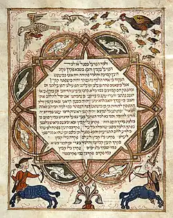 The manuscript's drawings combine Christian, Islamic, and folk motifs. It has 24 canonical book headings, 49 parashiyot, 27 pages of profusely illuminated arcaded forms framing the text of the grammatical treatise Sefer Mikhlol, 9 carpet pages, and 150 psalm headings.[34] There is frequent use of anthropomorphic and zoomorphic (human- and animal-shaped) letters, an old tradition that had been developed in Merovingian scriptoria at the end of the 8th century, that reappears in this manuscript.[33] The decoration is based on a wide variety of models from the past, including the Cervera Bible. Another characteristic feature of the Kennicott Bible, which it also shares with the Cervera Bible, is the inclusion of narrative and figurative illustrations. In this way, the two illuminators broke with the anti-figurative tradition of Sephardic Bibles.[4]
