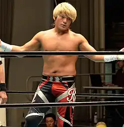 Kenoh returned to Noah as a freelancer, joining the new Choukibou-gun stable in 2014 and forming a tag team with stablemate Hajime Ohara.[5] On August 2, 2014, Kenoh and Ohara won the 2014 NTV G+ Cup Junior Heavyweight Tag League by defeating Daisuke Harada and Quiet Storm in the finals.[6] On October 12, Kenoh and Ohara defeated Atsushi Kotoge and Taiji Ishimori to win the GHC Junior Heavyweight Tag Team Championship.[7] They lost the title to El Desperado and Taka Michinoku on March 15, 2015.[8] On March 28, Kenoh signed a contract with Noah, officially ending his affiliation with Michinoku Pro.[9] On March 19, 2016, Kenoh and Ohara won the GHC Junior Heavyweight Tag Team Championship for the second time by defeating Atsushi Kotoge and Daisuke Harada.[10] They lost the title back to Kotoge and Harada on April 5.[11]
