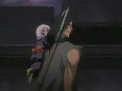 Prior to entering the Soul Reaper ranks, Zaraki resided in District 80, the most lawless district surrounding the Soul Society. He became very proficient with swordsmanship, or at least fighting, while he was there, and eventually adopted the district's name, "Zaraki", as his surname. He also took a Zanpakutō still in its "Asauchi" state from a corpse and made the weapon his own, though unable to hear its spiritual embodiment. During that time, he met a kindred spirit in Squad 4's Retsu "Yachiru" Unohana, both leaving their opponent with a scar during their duel. After leaving the district he found a small girl who, despite her young age, did not fear his sword. Since she had no name, unaware that she is actually a manifestation of his Zanpakutō, Zaraki named her "Yachiru" after Unohana while christening himself "Kenpachi", Unohana's title which has been associated with one who has killed many.[2] Yachiru became inseparable from Zaraki from that point further, following him wherever he went, usually clinging to his back.