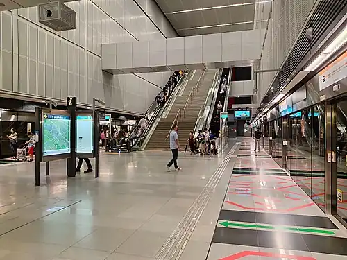 The station is wheelchair accessible. A tactile system, consisting of tiles with rounded or elongated raised studs, guides visually impaired commuters through the station,[24] with dedicated tactile routes that connect the station entrances to the platforms.[25] Wider fare gates allow easier access for wheelchair users into the station.[25]