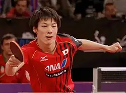 Kenta Matsudaira (松平 健太, Matsudaira Kenta; born April 11, 1991) is a Japanese table tennis player. Winner of the 2006 World Junior Championships in singles,[4] he was the world number one junior player in 2008.[5] He is world-renowned for his tomahawk serve, which he has popularized throughout his career. The serve itself is rather unorthodox but still ample in efficiency, making it even more effective due to its unfamiliar nature. His serve has been one of the imperative factors in his illustrious junior career, alongside making him a top 50 player for many years. He also utilizes its reverse variation.[6]