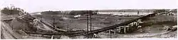 The construction of Kentucky Dam and its reservoir required the purchase 320,244 acres (129,598 ha) of land, 48,496 acres (19,626 ha) of which had to be cleared. 2,609 families, 3,390 graves, and 365 miles (587 km) of roads had to be relocated. 65 new bridges were built, 7 were rebuilt, and 3 were razed. The Illinois Central Railroad— which crossed a bridge just downstream from the dam— was rerouted to cross the top of the dam. The communities of Johnsonville and Springville in Tennessee, and Birmingham in Kentucky were completely inundated by the project. A protective dike was constructed at Big Sandy, Tennessee to protect the town from reservoir backwaters.[1]