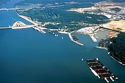 Kentucky Dam is served by a 600-by-110-foot (183 by 34 m) navigation lock, soon to be supplemented by a larger 1,200-by-110-foot (366 by 34 m) lock which will be better able to accommodate the long barge tows that navigate the river in the 21st century.[4] A large industrial complex of chemical plants has developed below the dam near Calvert City due to the convenient barge transportation and inexpensive TVA electricity. The locks' lift raises and lowers vessels up to 75 feet (23 m) between Kentucky Lake and the lower part of the river.[1]