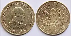 Between 1967 and 1978, the portrait of Jomo Kenyatta, the first president of Kenya, originally appeared on the obverse of all of independent Kenya's coins. In 1980, a portrait of Daniel arap Moi replaced Kenyatta until 2005, when the central bank introduced a new coin series that restored the portrait of Kenyatta. The coins are -/50 and 1/= in stainless steel and bi-metallic coins of 5/=, 10/= and 20/=. A bi-metallic 40/= coin with the portrait of then-President Mwai Kibaki was issued in 2003 to commemorate the fortieth anniversary of Kenyan independence (1963).[2]