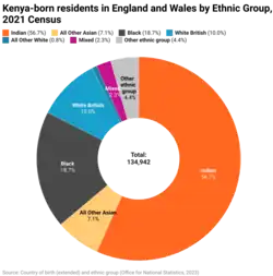 The 2001 UK Census recorded 129,633 Kenyan-born British residents.[6] The 2011 census recorded 135,966 Kenyan-born people resident in England, 1,526 in Wales,[7] 2,743 in Scotland[8] and 301 in Northern Ireland,[9] making a UK total of 140,536. The equivalent UK figure in 2019 has been estimated at 121,000 by the Office for National Statistics.[10]