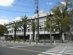 The Kagawa Prefectural Government Hall on the island of Shikoku was completed in 1958. Its expressive construction could be likened to the Daibutsu style seen at the Tōdai-ji in Nara.[15] The columns on the elevation bore only vertical loads so Tange was able to design them to be thin, maximising the surfaces for glazing. Although the hall has been called one of his finest projects,[16] it drew criticism at the time of its construction for relying too heavily on tradition.[17]