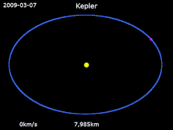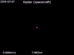 NASA has characterized Kepler's orbit as "Earth-trailing".[61] With an orbital period of 372.5 days, Kepler is slowly falling farther behind Earth (about 16 million miles per annum). As of May 1, 2018, the distance to Kepler from Earth was about 0.917 AU (137 million km).[3] This means that after about 26 years Kepler will reach the other side of the Sun and will get back to the neighborhood of the Earth after 51 years.