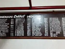 Other dishes include piralen (chicken stir-fried), meat thoran/ roast/ullathiyathu (dry curry with shredded coconut), seafood and duck roast, and meen molee (spicy stewed fish).[16] This is eaten with appam.[16] Pork vindaloo and Meen mulakittathu or meen vatichathu (fish in fiery red chilli sauce) is another favourite item.[16]