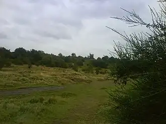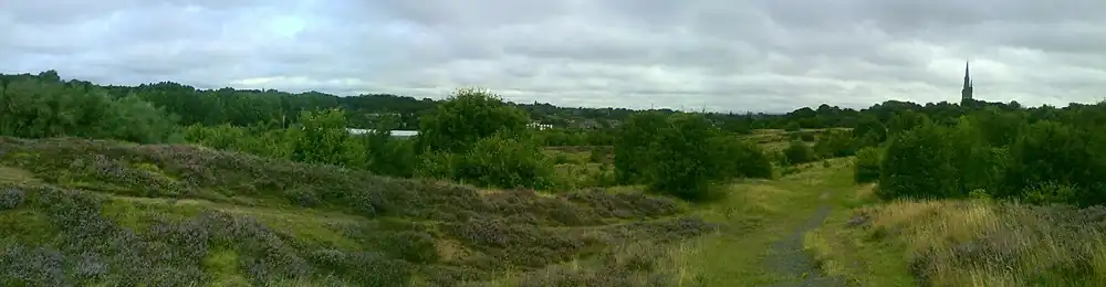 Kersal Moor is one of the many fluvioglacial ridges that formed along the Irwell Valley during the melting of the glaciers at the end of the last ice age.[6] Typically for this type of landform, the subsoil is composed of sand mixed with coarse gravel. The 19th century botanist Richard Buxton described this as "Mr E.W. Binney's drift deposit no.2 ... a deposit of sharp forest sand, parted with layers of gravel composed of Azoic, Palaeozoic and Triassic rocks, well rounded, parted with layers of fine sand, and having every appearance of a regular deposit by water."[nb 1][7] This deposit is overlaid with a thin topsoil supporting a range of mosses, heathers, grasses, ferns,[8] common broom, gorse and some trees, which are predominantly oak with some rowan, cherry and other broadleaved species. The land to the south is elevated, rising to a high point towards the south-west. From this elevated position there are views across Manchester to the Derbyshire hills in the south, to the Pennines in the north east and across the Irwell Valley and Salford in the west. The land falls away to the north, ending with two drumlin-shaped hills on the northern edge, which were probably formed by sediment from the meltwater of the receding glaciers, in a process known as sedimentary fluting. The moor is criss-crossed with footpaths, many of which cut through to the sand and gravel below. Singleton Brook, to the north of the moor, denotes the boundary between Salford and Prestwich.