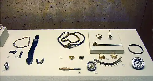 Late Roman artifacts are very rare, and it is very rare for a female's tomb to contain both a Roman needle and a fibula. Less than 12% of the graves contained both fibulae and hairpins. Grave decorations are not uniform, there are hardly any Roman motifs on the women's jewellery, but there are many examples of jewellery with Germanic motifs.[3]