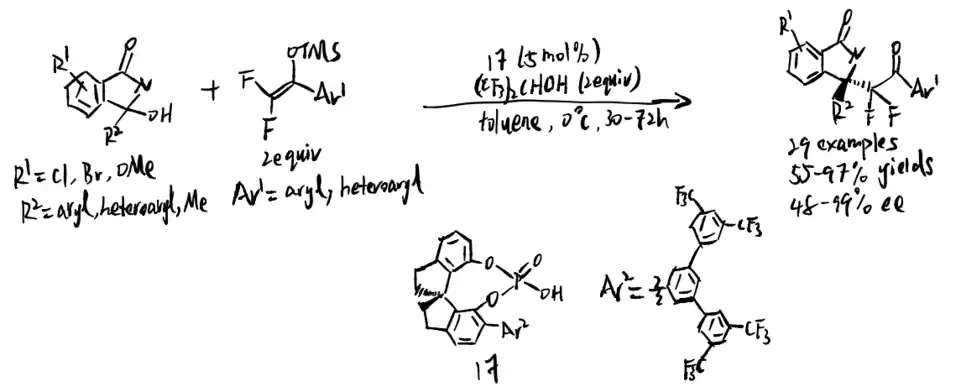In 2020, Zhang, Ma, and coworkers used 3-hydroxyisoindolin-1-ones to produce endocyclic N-acyl ketimines by chiral phosphoric acid-catalyzed Mukaiyama–Mannich reaction. Difluorinated silyl enol ethers are involved to produce enantioenriched fluoroalkyl-functionalized isoindolones first. Through the reaction under different conditions, two features were discovered. Firstly, hexafluoroisopropyl alcohol could enhance the reactivity and enantioselectivity. Secondly, reaction is better catalyzed by catalyst with trifluoromethyl group chiral barriers.[12]