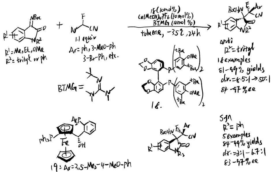 Wolf and coworkers further developed a copper-catalyzed stereo-divergent Mannich reaction in 2020.[14] Isatin-derived ketimines first react with α-fluoro-α-arylnitrile and result in a chiral cuprous keteniminate complex. Then, BTMG would act as a nucleophile and the stereoselectivity would be determined by the chosen of chiral ligands. From experiment, Segphos–copper complex generated anti diastereomers while Taniaphos complex results in syn diastereomers.